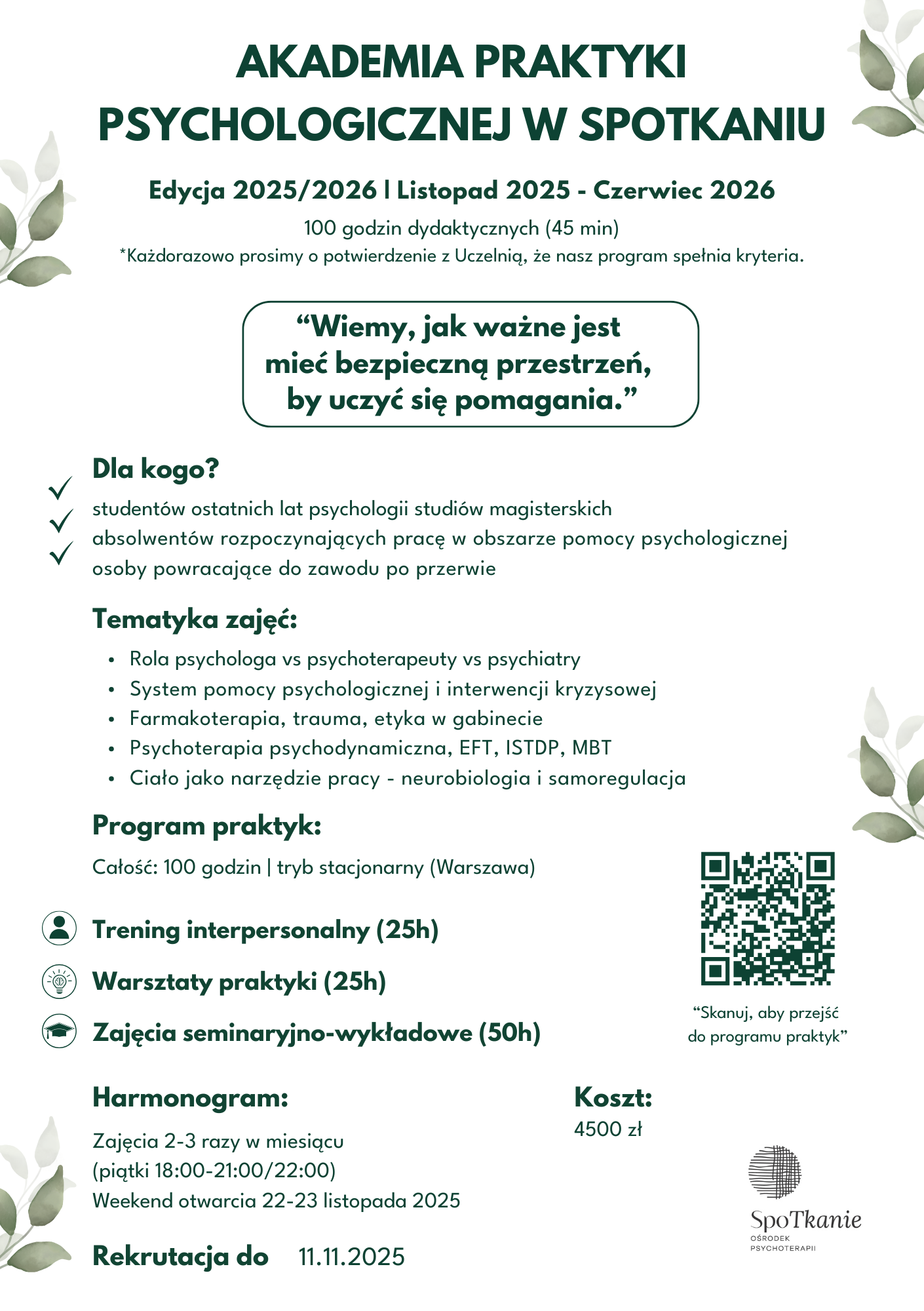 Propozycja współpracy w zakresie praktyk i rozwoju zawodowego studentów psychologii – „Akademia Praktyki Psychologicznej w SpoTkaniu”. Program jest przeznaczony dla studentów i absolwentów psychologii, którzy chcą zdobyć praktyczne doświadczenie w obszarze psychoterapii, pomocy psychologicznej oraz interwencji kryzysowej. Więcej szczegółów: Akademia Praktyki Psychologicznej 2025