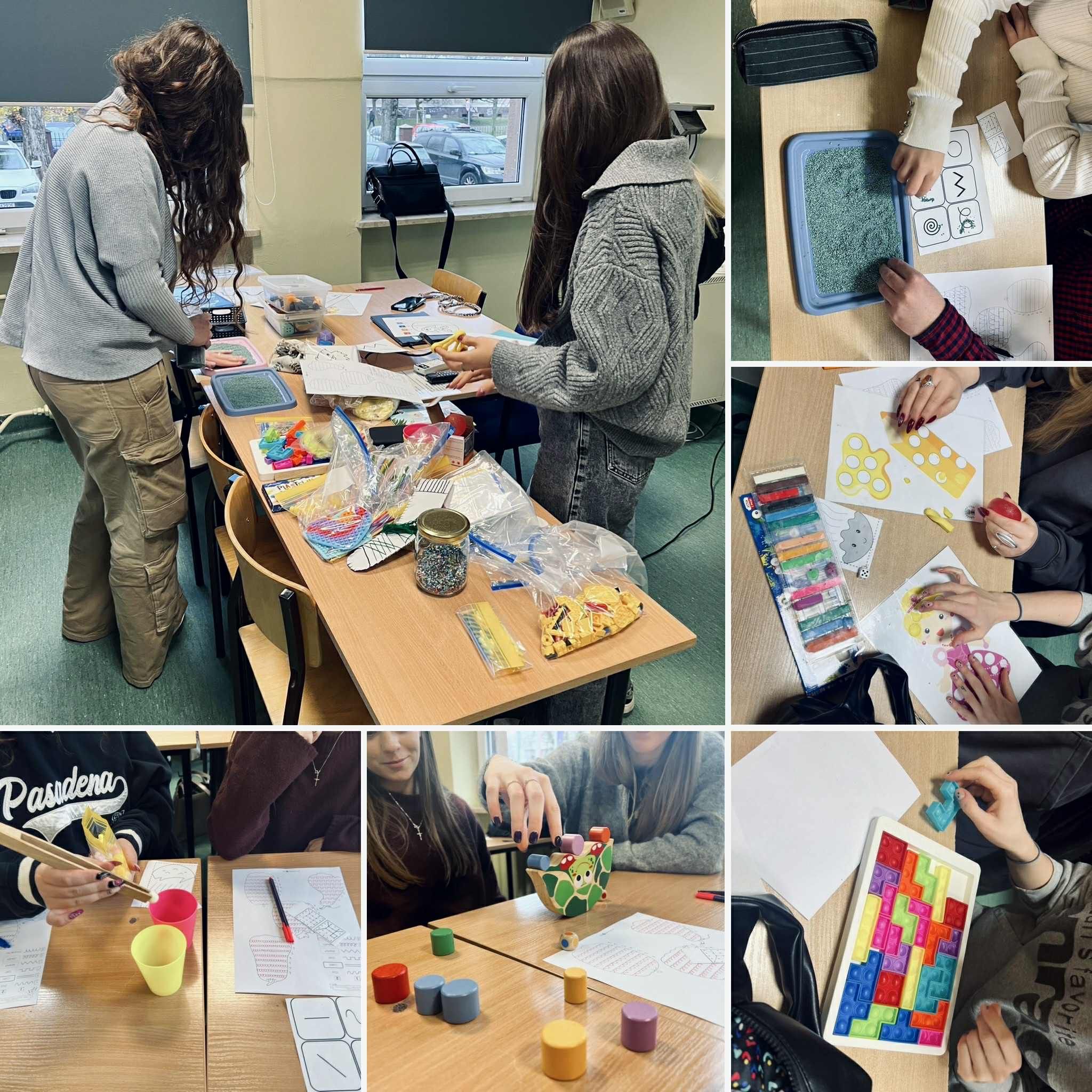 Studentki IV roku Terapii Pedagogicznej, podczas zajęć z przedmiotu Działania profilaktyczne w terapii pedagogicznej prowadzonych przez Julię Więckiewicz-Modrzewską, zaprezentowały samodzielnie opracowane ćwiczenia grafomotoryczne oraz aktywności rozwijające sprawność manualną.