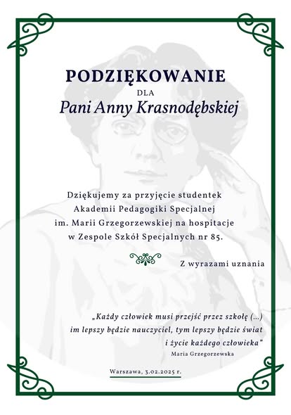 Dziękujemy Zespołowi Szkół Specjalnych nr 85 za współpracę, inspirującą atmosferę oraz wsparcie w kształceniu przyszłych pedagogów specjalnych.
